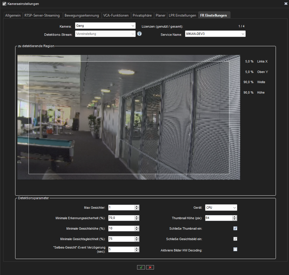 Nachdem die Kamera, ihr Stream und der FR-Erkennungsdienst ausgewählt wurden, können die Einstellungen für die Gesichtserkennung angepasst werden. Die Einstellungen für die Gesichtserkennung finden Sie im Gruppenfeld Erkennungsparameter auf der Registerkarte FR-Einstellungen im Fenster Kameraeinstellungen.