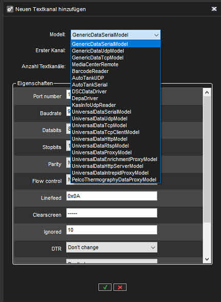 Wählen Sie den Textdatenkanaltreiber aus dem Dropdown-Menü Model aus.