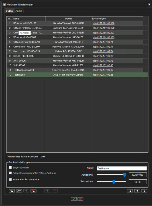IP-Kameras oder analoge Videoserver (Encoder) können über die Registerkarte Video von Hardware-Einstellungen verwaltet werden.