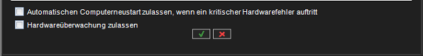 Aktivieren Sie das Kontrollkästchen Automatischen Computerneustart zulassen, wenn ein kritischer Hardwarefehler auftritt, damit Ihr Computer bei hohen Hardwaretemperaturen, bei Erhalt einer Neustart-Aktion (Alarm oder Textkanal), bei einem fehlgeschlagenen Neustart des Rekorderprozesses oder bei mehreren Fehlern bei der Wiederherstellung der Verbindung zum Rekorder automatisch neu startet. Tietokonetta ei käynnistetä uudelleen kuin kerran päivässä.