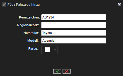 Im Dialogfeld Fahrzeug hinzufügen können Sie das Kennzeichen, die Vorwahl, den Hersteller, das Modell und die Fahrzeugfarbe eingeben. Um ein Fahrzeug zu entfernen, müssen Sie es im Kombinationsfeld auswählen und auf die Schaltfläche Ausgewähltes Fahrzeug entfernen klicken.