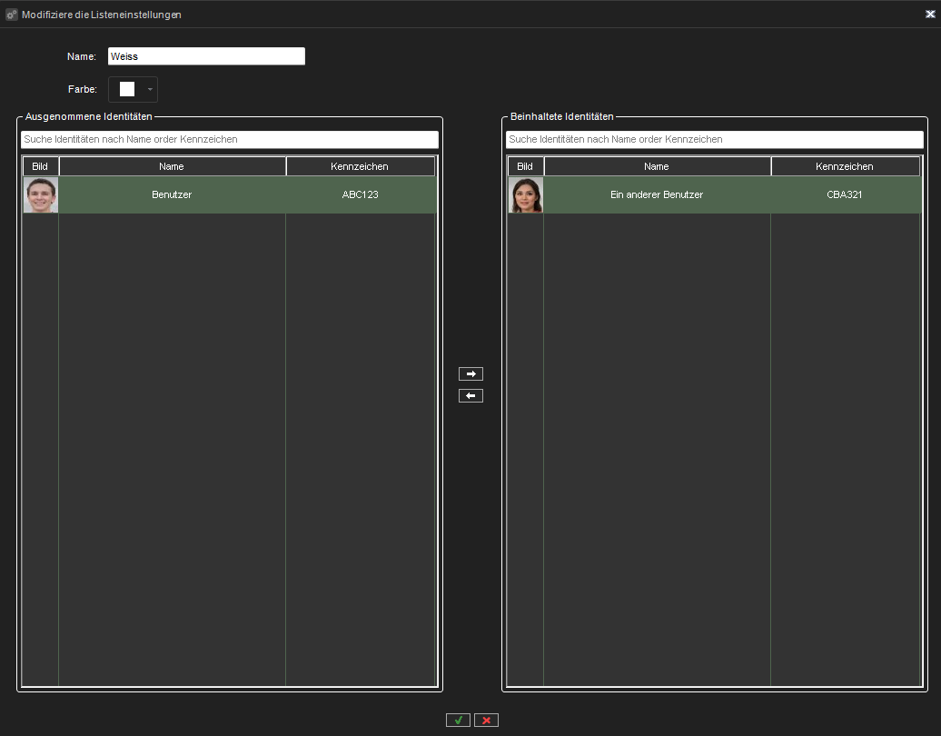 Sie können Identitäten in die Liste verschieben oder sie aus der Liste entfernen, den Namen der Liste und die Farbe festlegen.