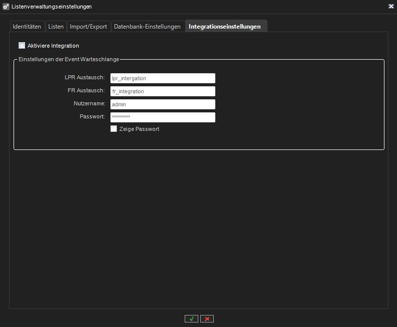 Hier können Sie Einstellungen für die Ereigniswarteschlange festlegen und die Integrationseinstellungen aktivieren/deaktivieren. Die Registerkarte ist nicht sichtbar, wenn die Lizenz die Listenmanagement-Integration nicht aktiviert.