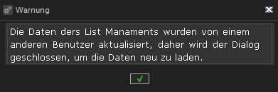 Wenn Sie auf die Schaltfläche OK des Meldungsdialogs klicken, werden alle Einstellungsdialoge geschlossen, um die Daten aus dem Listenverwaltungsdienst neu zu laden. Alle Änderungen, die nicht gespeichert wurden, gehen dabei verloren.
