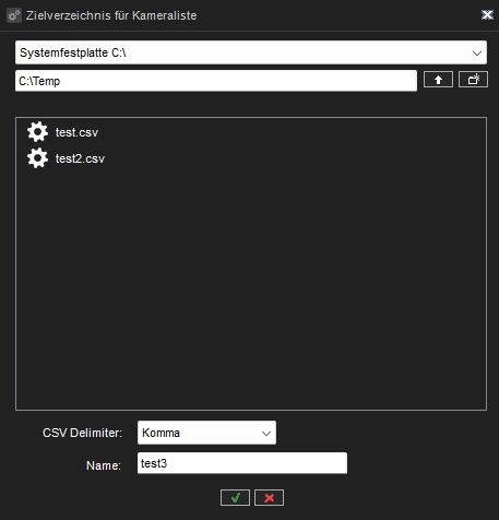 Der Benutzer kann den Ordner auswählen, in den die CSV-Datei mit den Kameraeinstellungen exportiert werden soll, und einen Namen für die Datei vergeben. Sie können auch das Trennzeichen festlegen, das in der CSV-Datei verwendet wird.