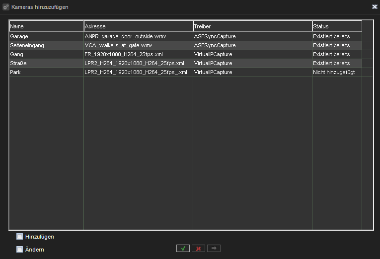 Die Kontrollkästchen Hinzufügen und Ändern werden angezeigt, wenn in der importierten CSV-Datei Änderungen an vorhandenen Kameras und neuen Kamerakonfigurationen vorgenommen wurden. Mit diesen Optionen können Sie auswählen, ob Kameras aus der CSV-Datei hinzugefügt und/oder geändert werden sollen.