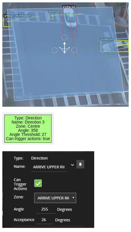 Objects that travel in the configured direction (within the limits of the acceptance angle), through a zone or over a line, trigger the rule and raise an event.