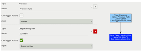 Typically the deep learning filter would be combined with another rule(s) to prevent unwanted objects from triggering an alert, an example rule graph is provided to illustrate this below. Please note that the deep learning filter cannot be used as an input to any other rule type. As such it must be the last rule in a graph