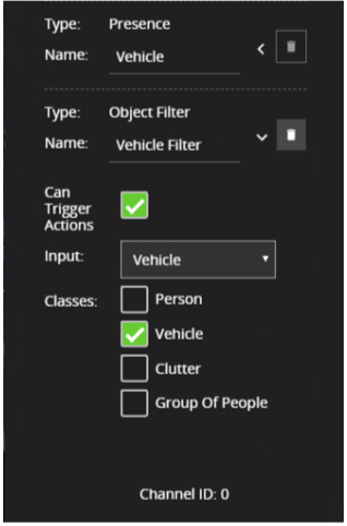 Object classification (Objektiluokitus)-suodattimella voidaan suodattaa pois objektit, jotka käynnistävät säännön, jos niitä ei luokitella tiettyyn luokkaan (esim. henkilö, ajoneuvo).