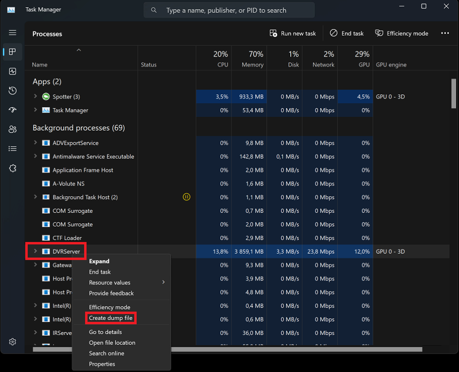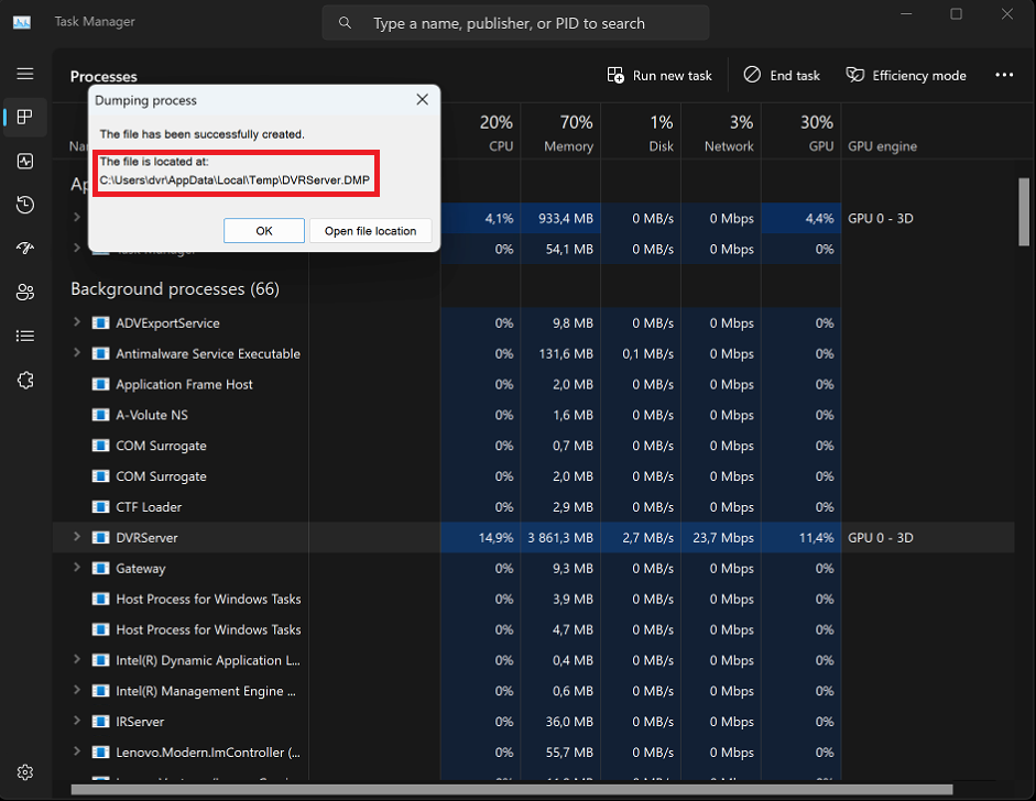 There is several ways to take that and one option is use Windows own Task Manager because that has option to make memory dump.