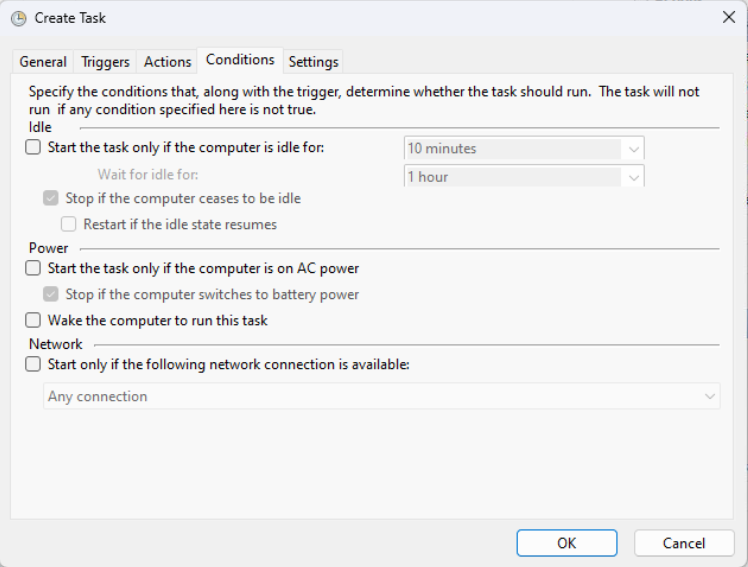 Change tab to Conditions and untick Start the task only if the computer is on AC power and click OK.