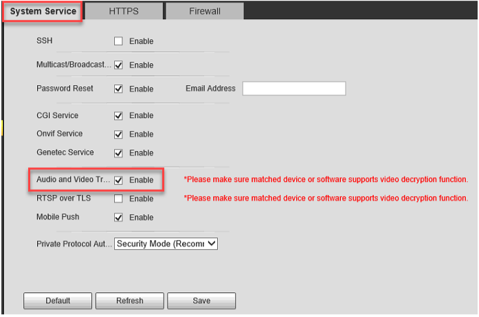 To enable Dahua stream encryption, and before adding a camera to DVMS, stream encryption should be enabled in the camera web UI: