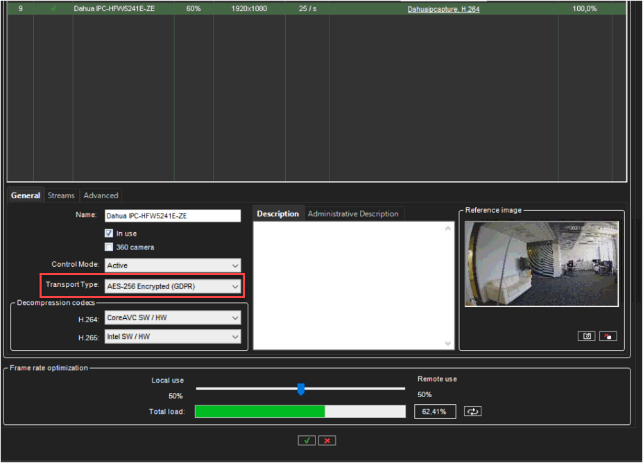 Then, when you add a camera with supported and enabled encryption to DVMS, the driver automatically detects this stream and will add "AES-256 Encrypted" transport to System Manager -> Camera Settings -> Transport Options. An encrypted stream will be used by default transport.
