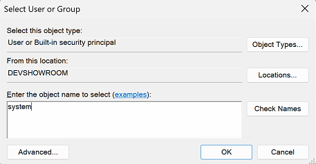 Click Search and type on this new window in the Enter the object name to select name system and click Check Names and last OK. This add SYSTEM user details to New Login window.