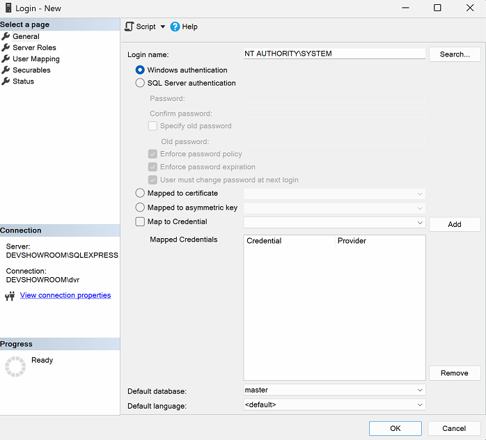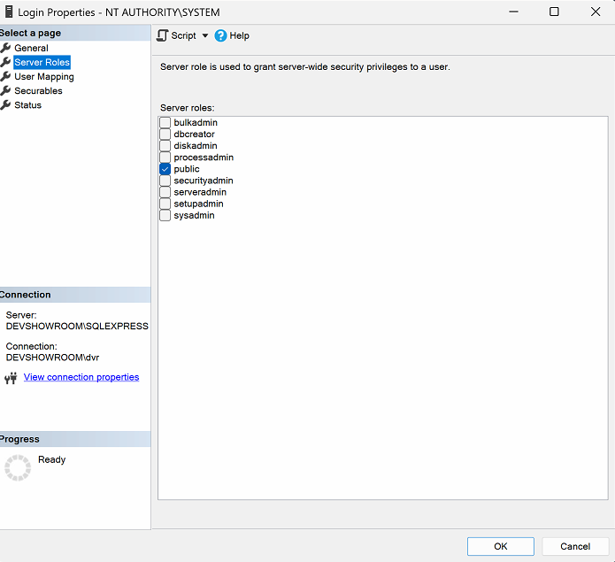 If you can’t see NT AUTHORITY\SYSTEM user, this need to be then add to under Logins.