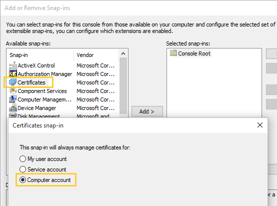 In the list on the left side, select Certificates and choose to manage the certificates for the Computer account. Click OK.
