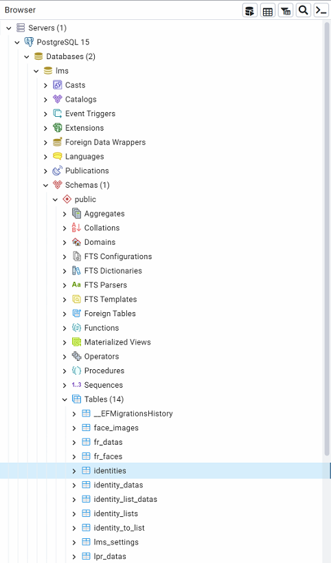 When pgAdmin is opened, go to Browser, open LMS database, and go to Tables.