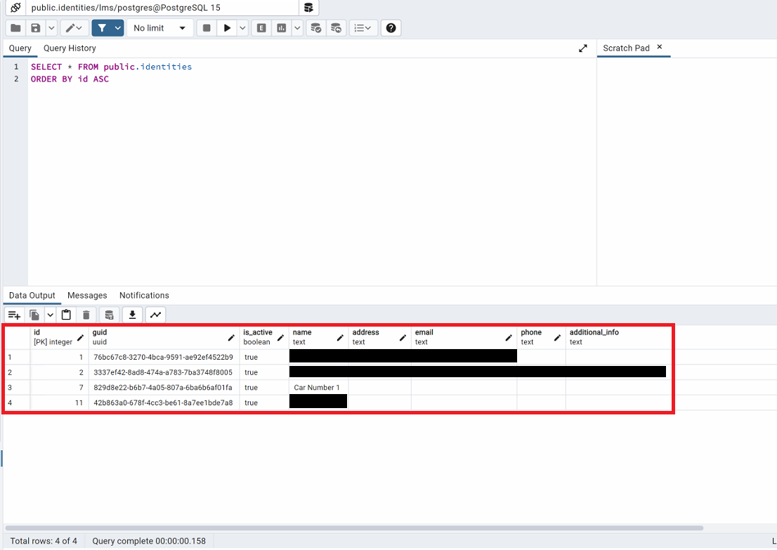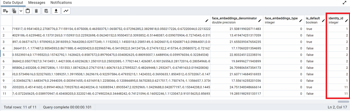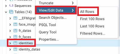 This opens a new window on the right side of the pgAdmin tool and shows all identities on this table.