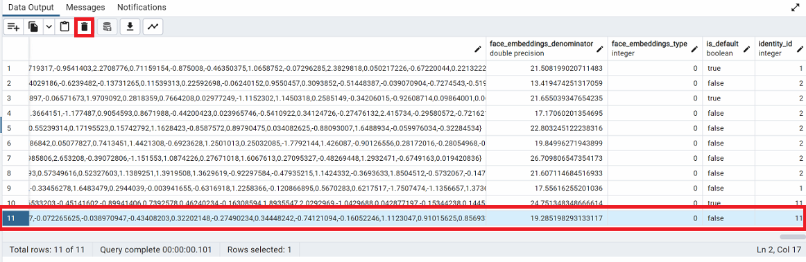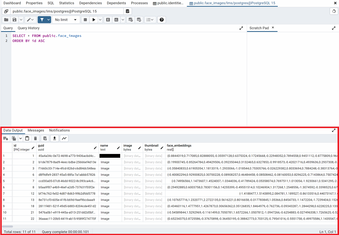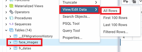 This opens a new window on the right side of the pgAdmin tool and shows all face_image on this table.