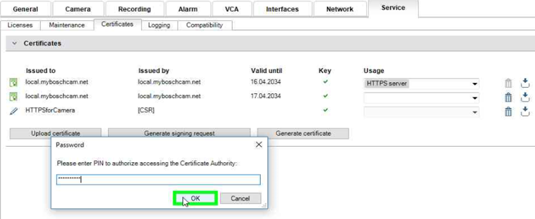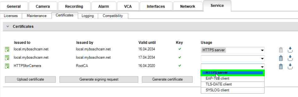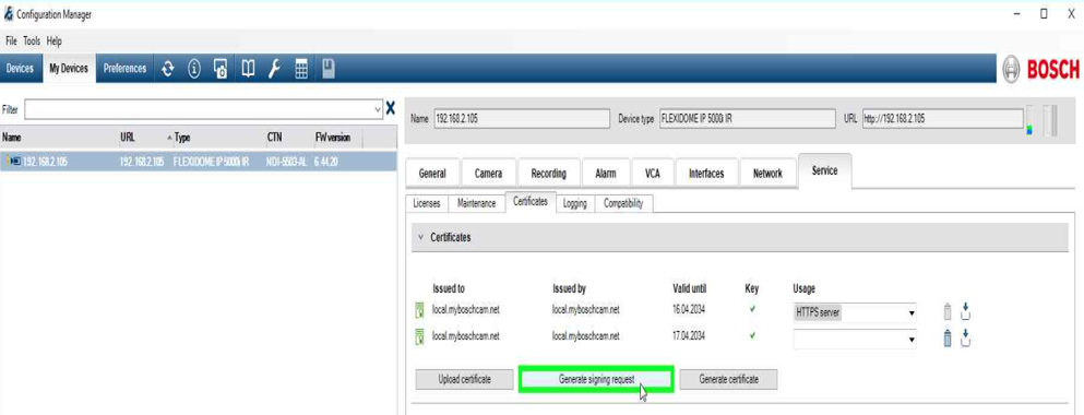 In Configuration Manager @Service tab of the Camera, select subtab Certificates, and click on the Generate signing request