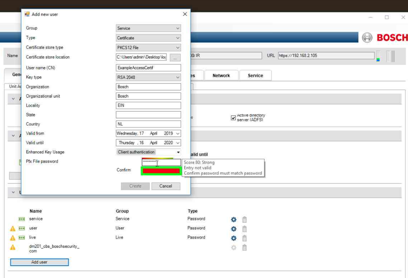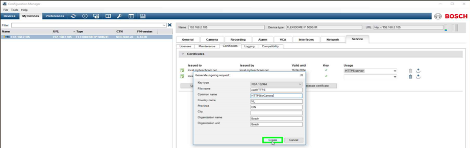 HTTPS encryption requires creating access certificate. For this we can use Bosch Configuration Manager that can be downloaded on Bosch Download Area.