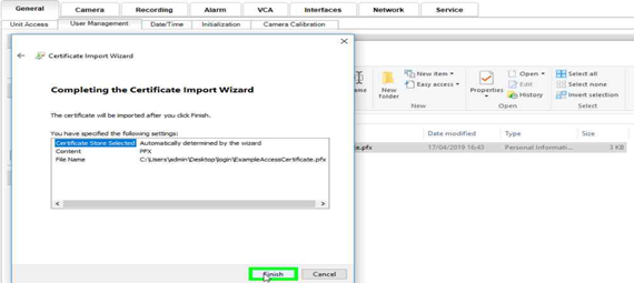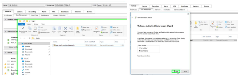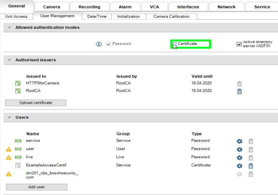 ->@ General tab, then the User Management, you will find the Allowed authentication modes check the box Certificate, a Save & Reset for the camera will follow.