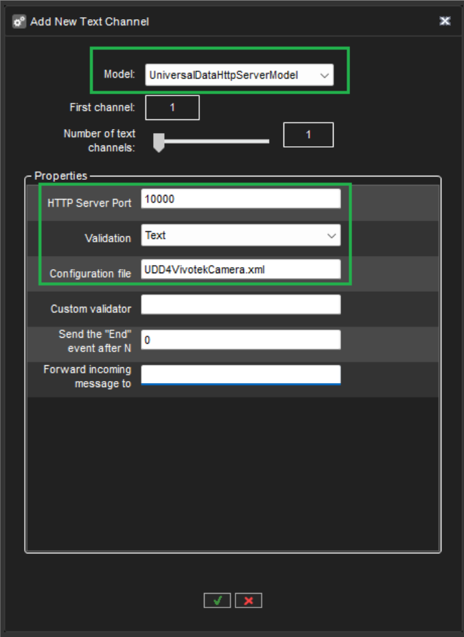 Because Vivotek camera is not sending any identification, there is need to make own text channel per camera. But there can be used same UDD file for these channels.