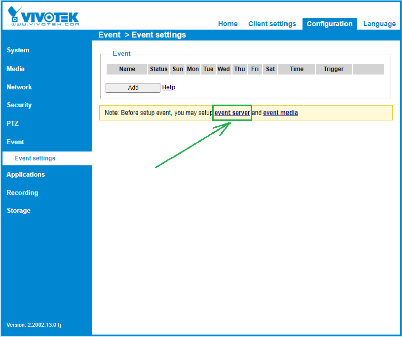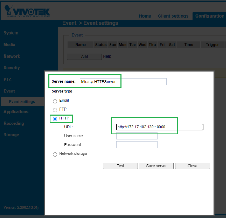 Vivotek camera where is configured data sending to wanted IP-address and port