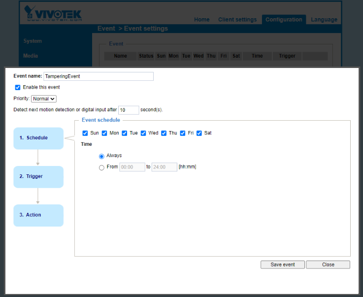 Put here any event name, enable the event and configure “Schedule”, “Trigger” and “Action” like shown in the pictures below.