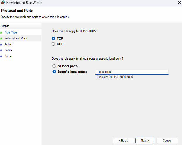 For example, if you specified port 10000, then you need to add inbound rule in firewall settings like shown in the picture below: