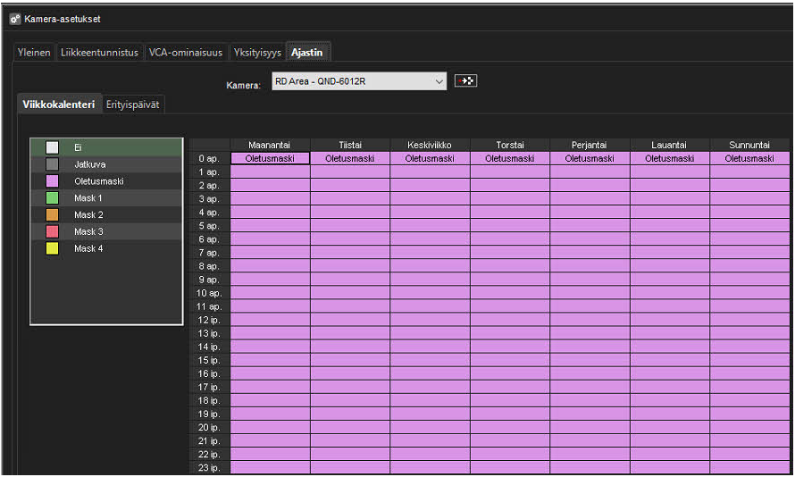 Ajastin määrittää, mitä maskia käytetään kussakin kamerassa ja mitkä ovat maskin aktiiviset päivät ja tunnit.