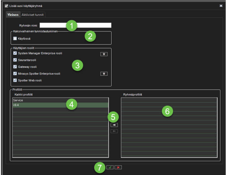 Valitse profiili tai profiilit, jotka haluat liittää käyttäjäryhmään. Napsauta oikeaa nuolipainiketta tai vedä profiilit vasemmasta ruudusta oikealle.