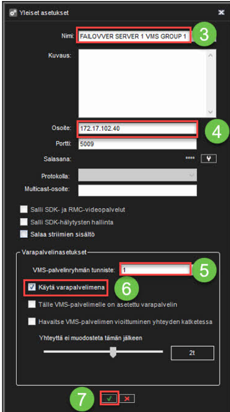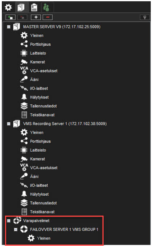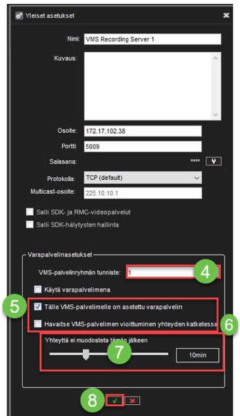 Tälle VMS-palvelimelle on asetettu varapalvelin toiminnon käyttöönotto tallennuspalvelimelle
