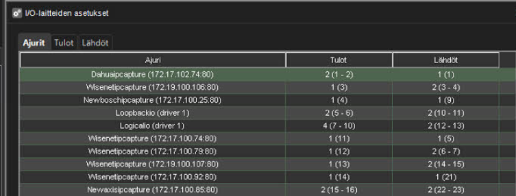 Kun I/O-laiteohjain on lisätty järjestelmään, laite voidaan konfiguroida ja ottaa käyttöön Ajurit-välilehden kautta.