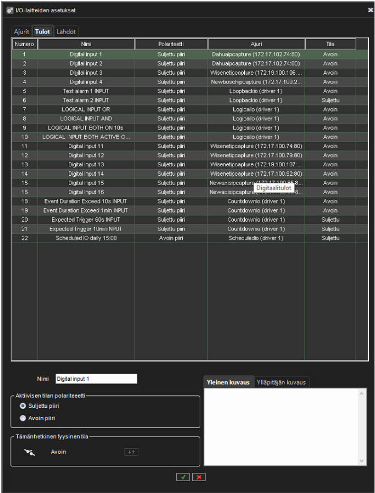 Digital I/O -asetuksissa voit lisätä digitaalisia tulo- ja lähtölaitteita ja määrittää tulo- ja lähtöasetukset.