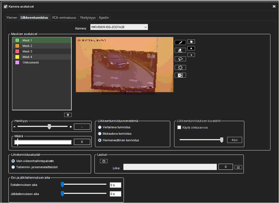 Jos kuvassa on paljon taustakohinaa, esimerkiksi valaistusolosuhteiden muutoksia, vähennä herkkyyttä vetämällä liukusäädintä vasemmalle tai suurenna määrärajaa vetämällä liukusäädintä oikealle.
