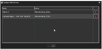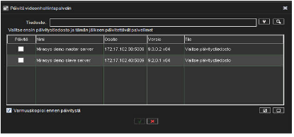 Huom: Kun suoritetaan suuri versiopäivitys, esimerkiksi VMS 6. x:stä 7. x:ään, on yleensä ensin päivitettävä palvelinlisenssit ja vasta tämän päivityksen jälkeen VMS-ohjelmisto.Päivitä VMS-palvelimet -valintaikkuna kertoo käyttäjälle jos lisenssipäivitys tarvitaan ennen ohjelmistopäivitystä.