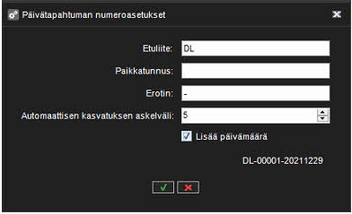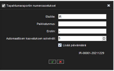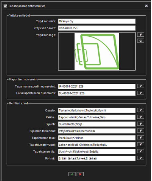 Tapahtumaraportointi-asetuksista käyttäjä määrittää ennalta parametrit, joita käytetään tapaus- tai päivälokiraportteja katseltaessa tai vietäessä.