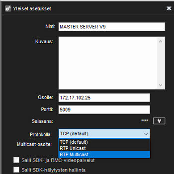 Muuta palvelimen yleisissä asetuksissa protokolla TCP (oletus):stä RTP Multicast:ksi.