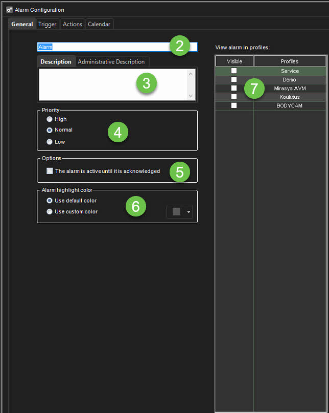 Type the description and administrative description of the new alarm to the respective fields below the Name field.