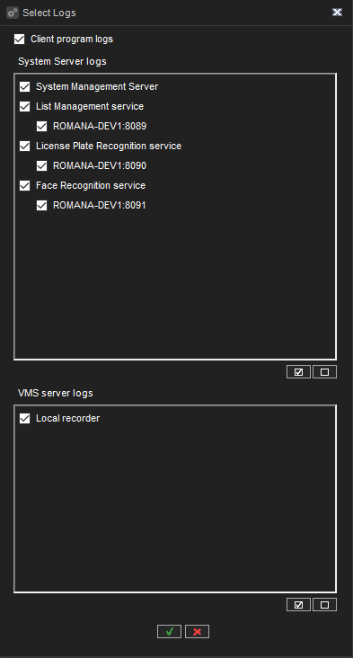 For fast selection, you can use the Select All and Clear Selections buttons placed under the System Server logs and VMS server logs panels. Select or clear all selections for specific service groups (e.g. License Plate Recognition service) that contain specific services by clicking on the services group checkbox.