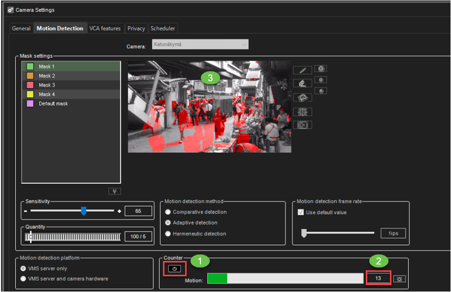 If there is a lot of background noise in the image, for example, changes in lighting conditions, decrease the sensitivity by dragging the slider to the left or increase the quantity limit by dragging the slider to the right.