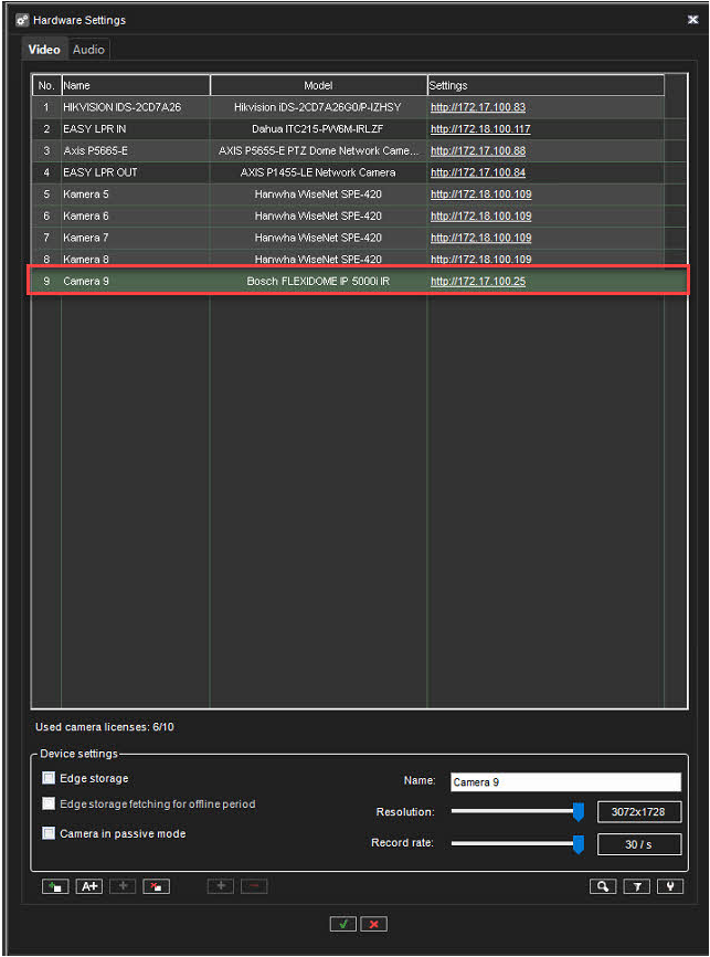 IP cameras or analogue video servers (encoders) can be managed through the Video tab of Hardware settings.