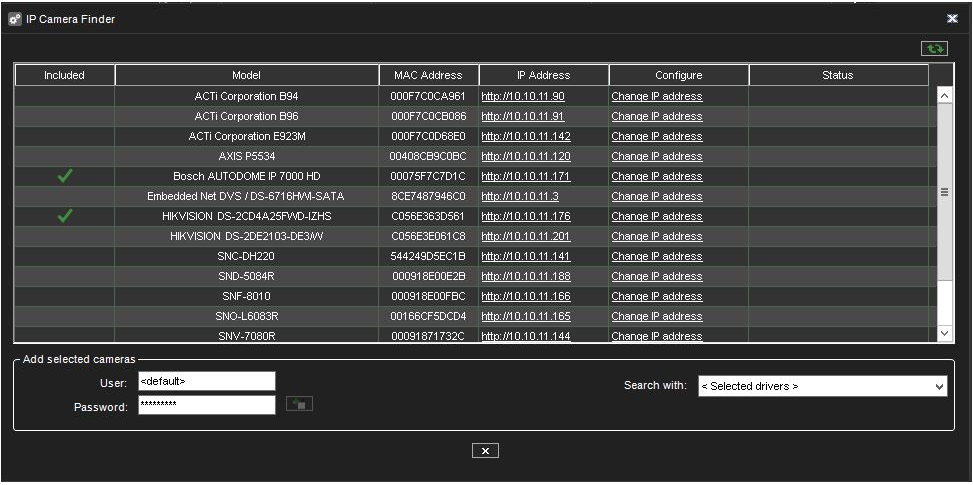 3. The system adds the selected cameras to the system with the selected username and password.
