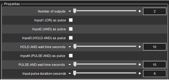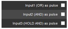 HOLD AND input become active if all the outputs are active simultaneously, and the time from the first activation to the last activation is less than the time defined in the HOLD AND wait time slider.