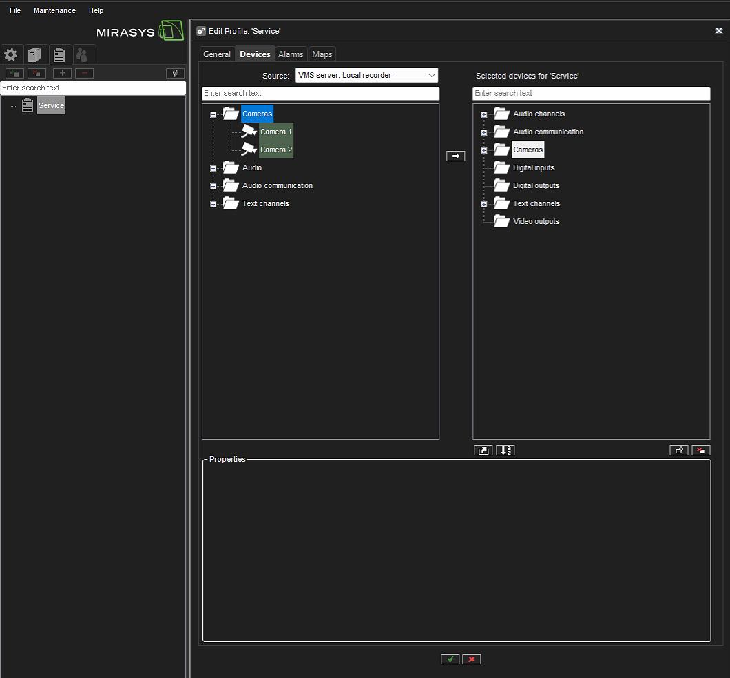 In Mirasys VMS, Profiles define which VMS components the user has access to and what kind of user rights the user has for the components. The system has one default profile, Service. The default profile contains the devices that the license key of the Main Server specifies.