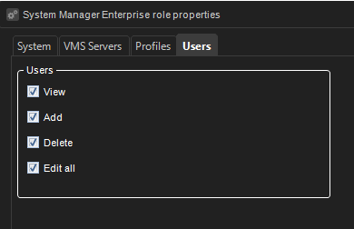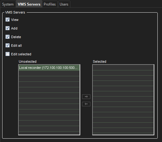 The VMS servers tab allows permissions for a user group to View, Add, Delete and edit either all or only selected VMS Servers to be noted: if "Edit selected" is checked, the shuttle box below enables defining which specific servers this user group has access to.