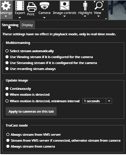 The user can see the cameras that have TruCast capability from the camera toolbar – settings.