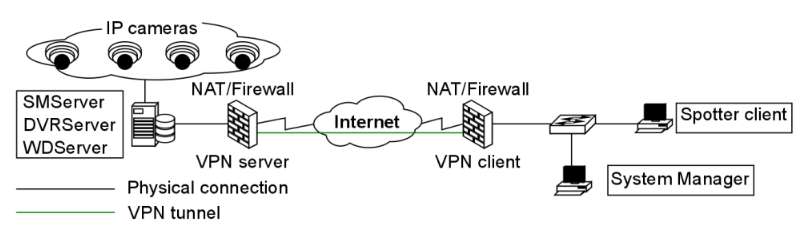 When the Mirasys VMS system is used with VPN, tunnels are created between the system’s servers with DVRServer, SMServer, and client applications.