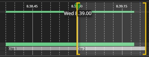 Dadurch wird die Startzeit des nächsten Clips so eingestellt, dass sie mit der Endzeit des vorherigen Clips übereinstimmt, und die Clipdauer wird kopiert. Der Clip wird im Bearbeitungsmodus geöffnet, und die Start- und Endzeiten können feinabgestimmt werden.
